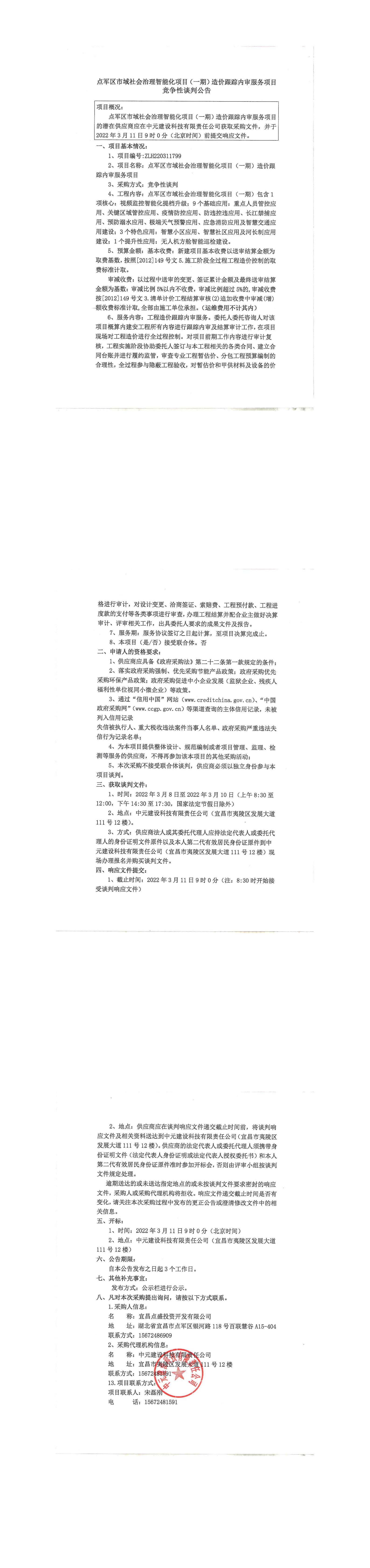 點(diǎn)軍區(qū)市域社會治理智能化項(xiàng)目(一期)造價(jià)跟蹤內(nèi)審服務(wù)項(xiàng)目談判公告