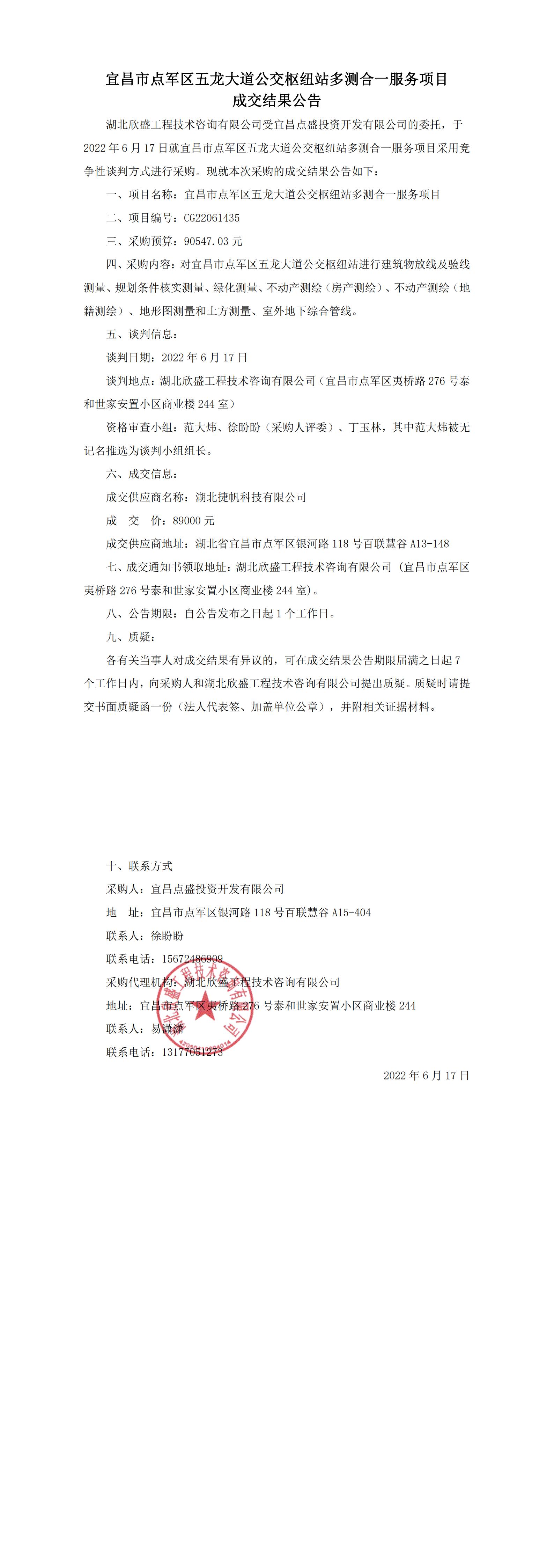 宜昌市點軍區(qū)五龍大道公交樞紐站多測合一服務項目成交結果公告