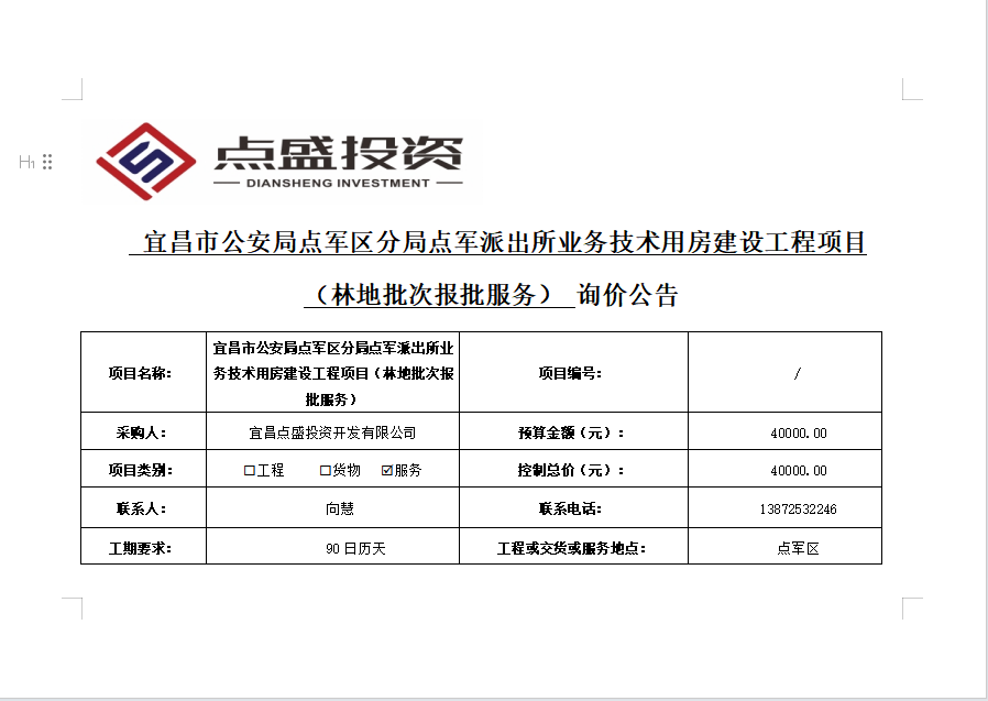 宜昌市公安局點(diǎn)軍區(qū)分局點(diǎn)軍派出所業(yè)務(wù)技術(shù)用房建設(shè)工程項(xiàng)目 (林地批次報(bào)批服務(wù)) 詢價公告