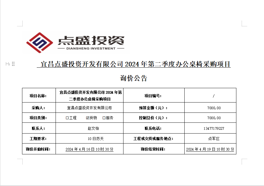 宜昌點(diǎn)盛投資開發(fā)有限公司2024年第二季度辦公桌椅采購項(xiàng)目 詢價公告
