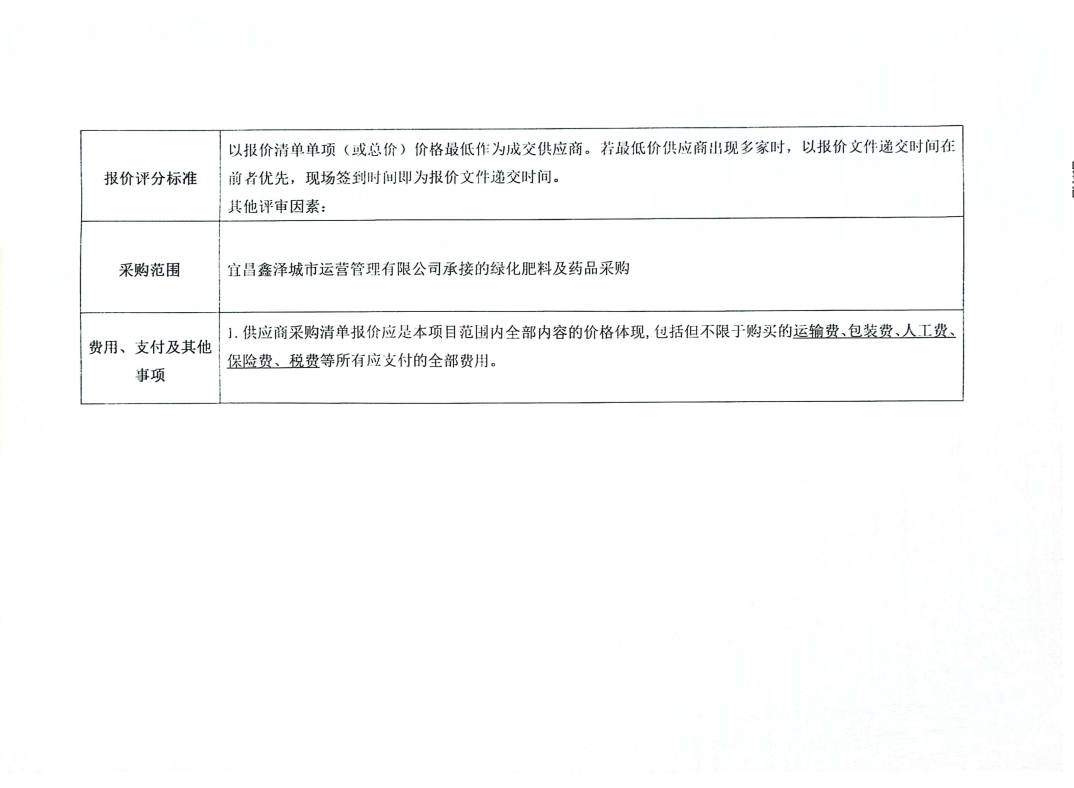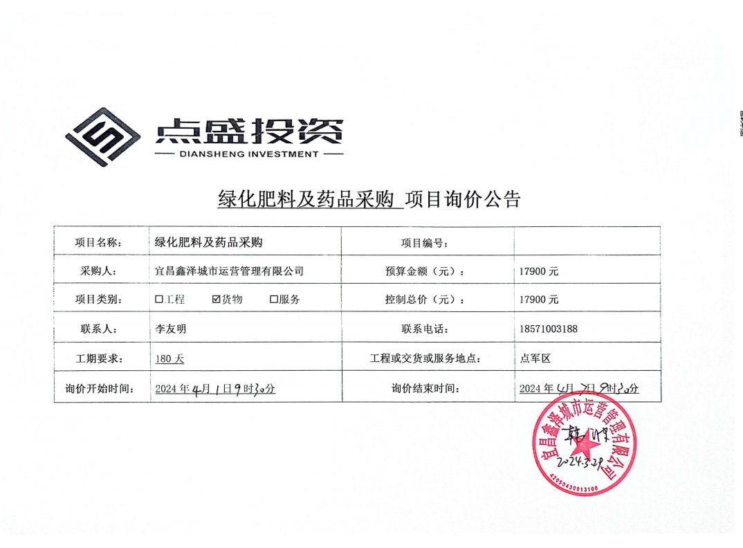 宜昌鑫澤城市運(yùn)營管理有限公司綠化肥料及藥品采購項目詢價公告