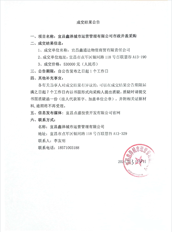 宜昌鑫澤城市運(yùn)營管理有限公司市政井蓋采購項目成交公告