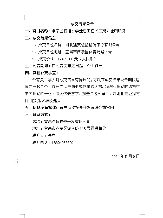 點軍區(qū)石堰小學遷建工程(二期)檢測服務成交公告