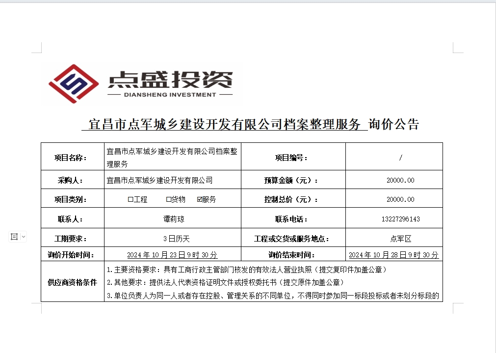 宜昌市點軍城鄉(xiāng)建設(shè)開發(fā)有限公司檔案整理服務(wù)詢價公告