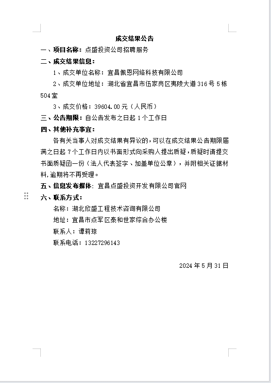 點(diǎn)盛投資公司招聘服務(wù)成交公告