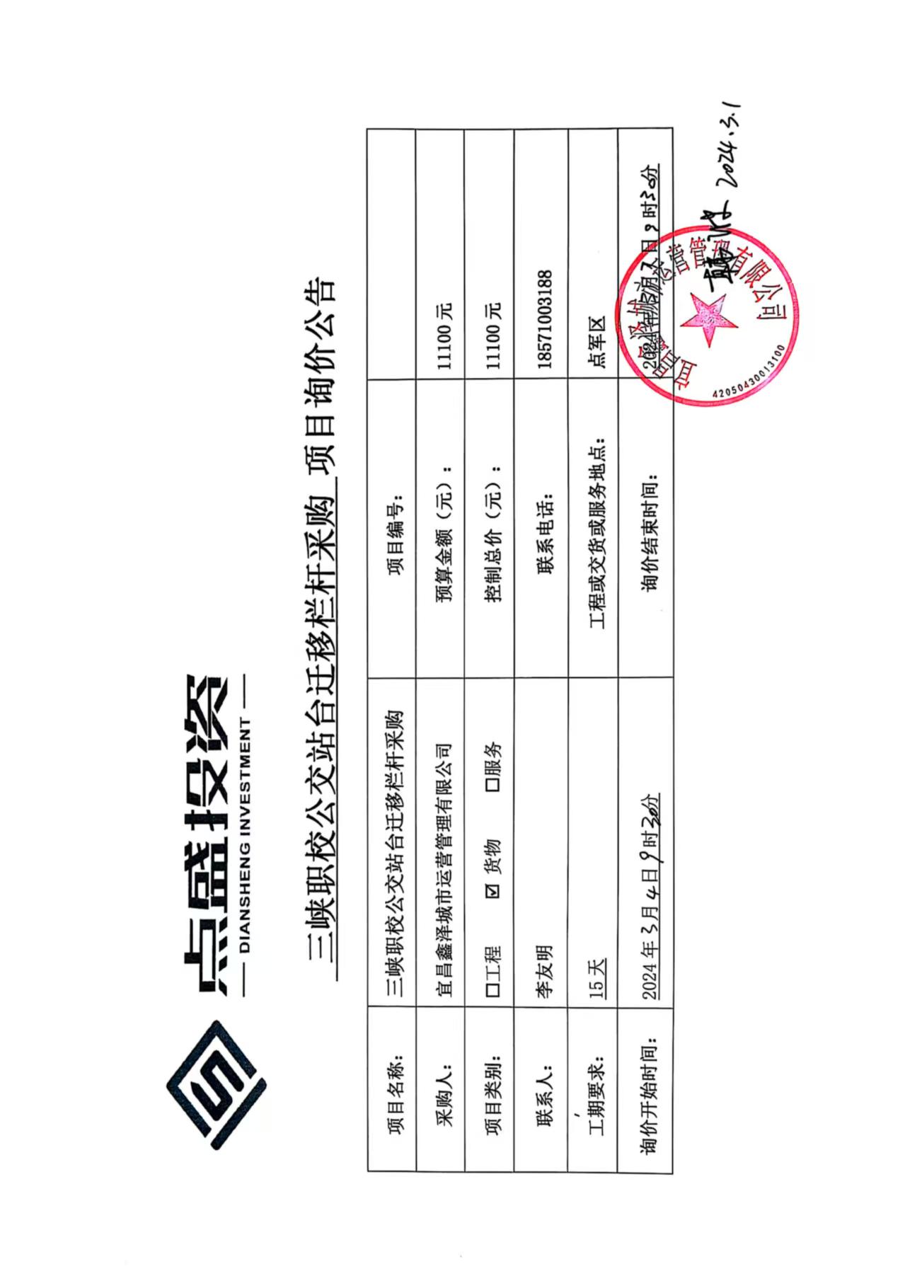 三峽職校公交站臺(tái)遷移欄桿采購詢價(jià)公告