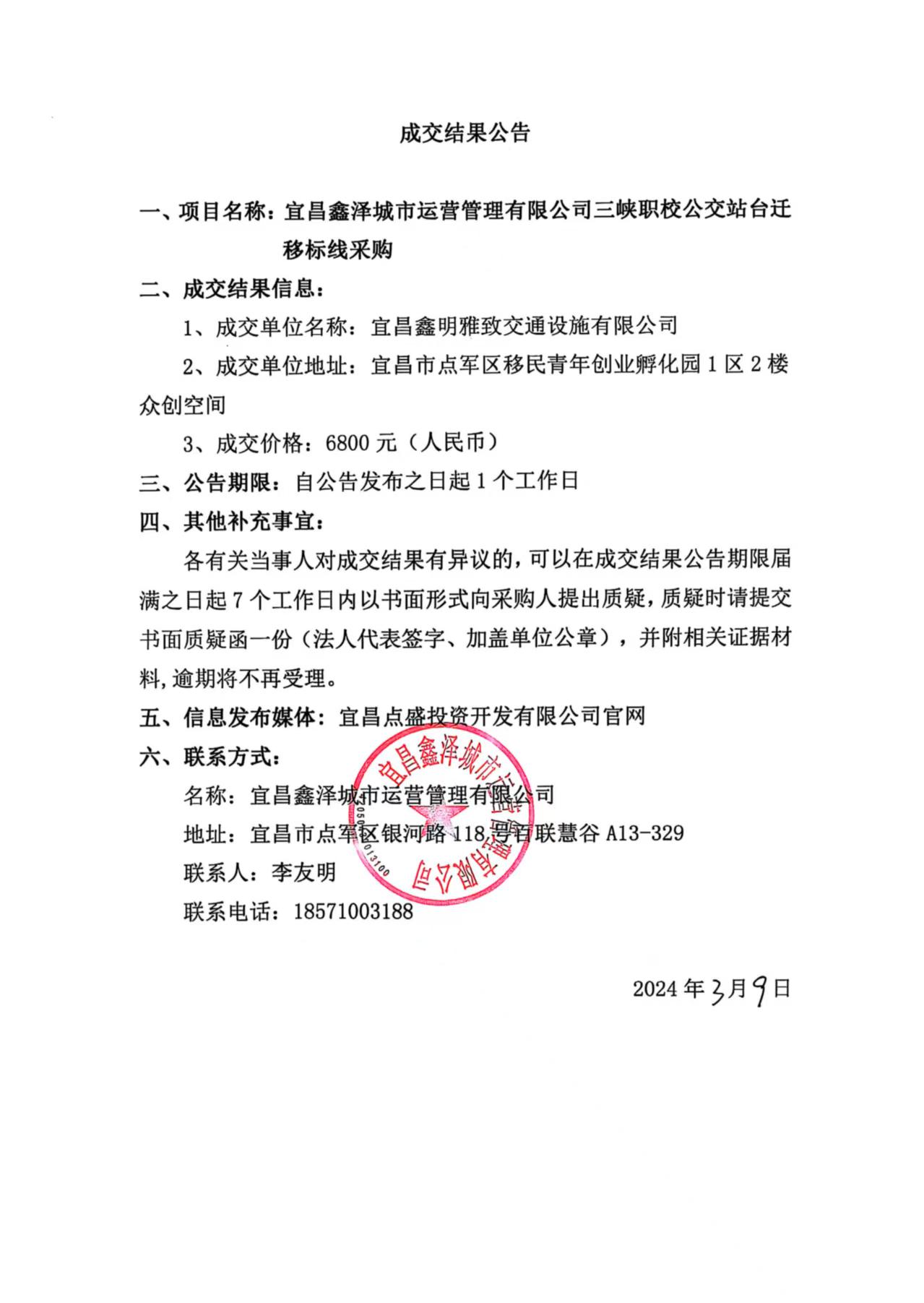 三峽職校公交站臺遷移標線采購成交公告